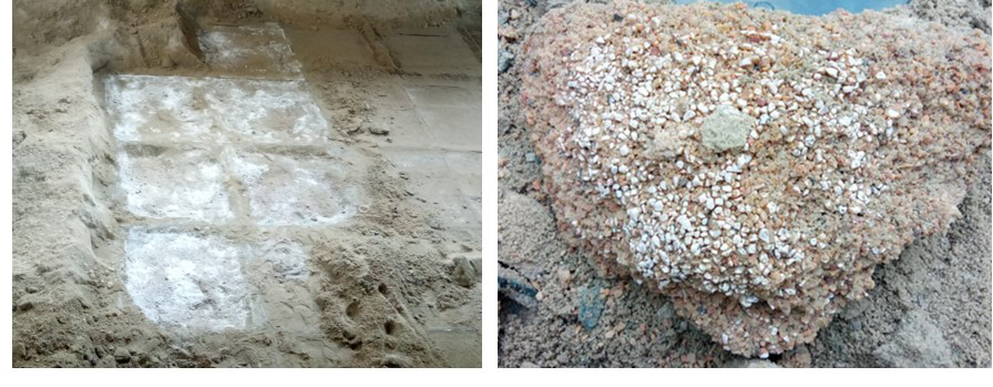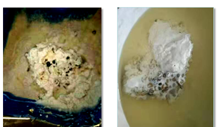 通過(guò)圖1可知,加藥并在規(guī)定的時(shí)間浸泡后,底濾池板結(jié)石頭表面明顯發(fā)白,翻開板結(jié)石頭,由于藥劑縱向滲透作用,使得深層的石頭板結(jié)處也出現(xiàn)同樣的現(xiàn)象。這是由于:原有的板結(jié)在藥劑滲透之處,會(huì)破壞板結(jié),生成另外一種白色的物質(zhì),在水中可以分散,通過(guò)反沖洗可以被廢渣帶走。