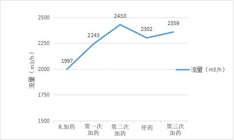 通過(guò)對(duì)比用藥前后,流量變化及流量穩(wěn)定性評(píng)價(jià)藥劑效果,按照現(xiàn)有工藝:每個(gè)底濾池每次出2爐渣后,進(jìn)行切換,從圖2可知,加藥后流量顯著改善,停藥期間流浪回落,這屬于正?,F(xiàn)象。整體而言流量能較好維持在2300m3/h左右。