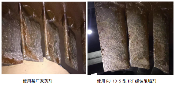 圖2 鋼廠使用某廠家藥劑與RJ-10-5型BPRT緩蝕阻垢劑開蓋后葉片對(duì)比圖